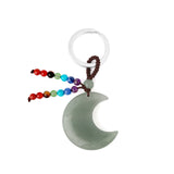This keychain is made with seven stones, each representing one of the chakras. The stones are strung together with a platinum-plated chain, and the keychain is shaped like a crescent moon with a star.