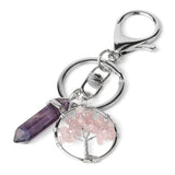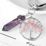 The Fluorite Tree of Life Pendants Keychain is made with natural stones and metals. It features a purple fluorite stone, a tree of life charm, and a lobster clasp. The keychain is approximately 101mm long and 20g in weight.