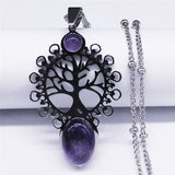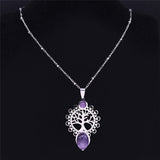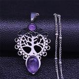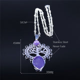 Bohemia Tree of Life Stainless Steel Purple Crystal Necklace For Women Silver Color Charm Necklace